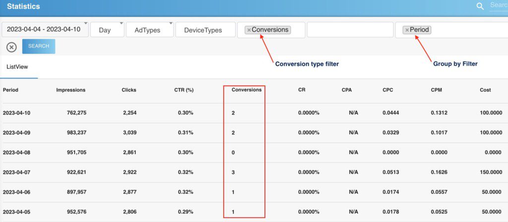 - You can use the “Group by” filter options to get full conversion stats, for example: Website, Adspace, Campaign, Add ID, Location, etc.